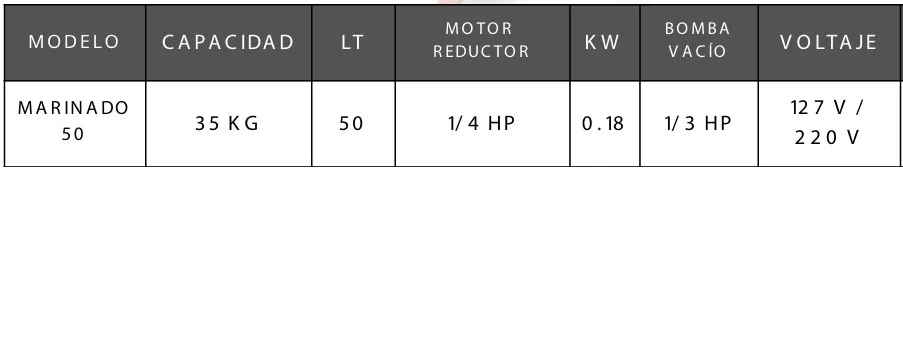 Marinadora al vacio Bonne Capacidad: 35 kg LT: 50 Motor reductor: 1/4 hp KW: 0.18 Bomba al vacío: 1/3 hp Voltaje: 127/220 V Desplazamiento: 4 CFM