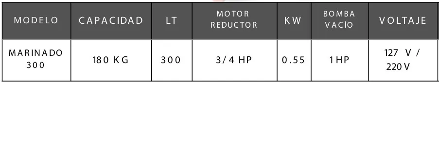 Marinadora al vacio Bonne Capacidad: 180 kg LT: 300 Motor reductor: 3/4 hp KW: 0.55 Bomba al vacío: 1 hp Voltaje: 127/220 V Desplazamiento: 12 CFM