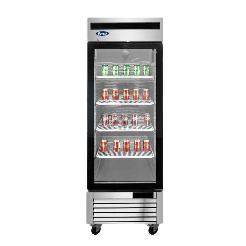Refrigerador para exhibición marca Atosa. Mod. MCF8705GR. 1 puerta. Con capacidad de 19.1 pies. Med. 0.68 x 0.80 x 2.11 m. alto. Exterior e interior de acero inoxidable. Refrigerante R290.